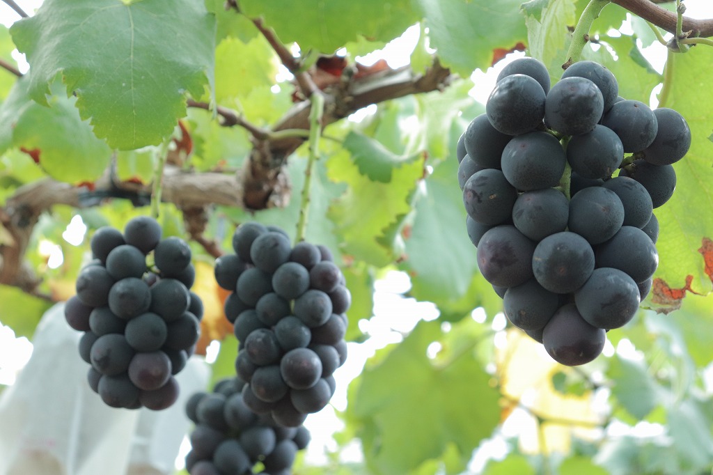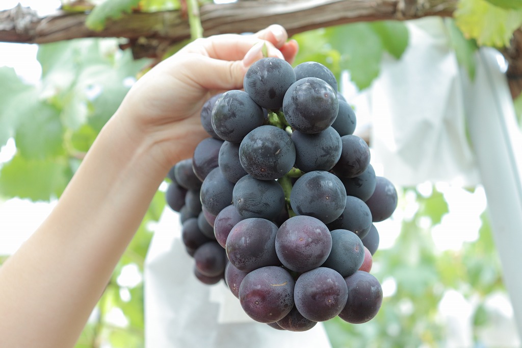 ピオーネ | 大粒で濃厚な甘みとほどよい酸味のバランスが良い。種あり。黒紫色で見た目も美しい。 | 8月下旬~9月上旬 | 黒紫色で丸みのある粒が特徴。 | ジューシーで食べ応えあり。ワイン用にも使用されることも。 |