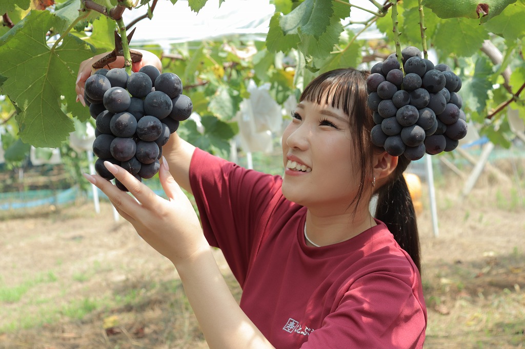 クイーンニーナ | 大粒でシャキッとした歯ごたえと強い甘みが特徴。種なし。皮が薄くて食べやすい。 | 8月下旬~9月中旬 | 赤紫色でやや楕円形の粒が多い。 | 食感が良く、みずみずしい。贈答用にも適している。 |